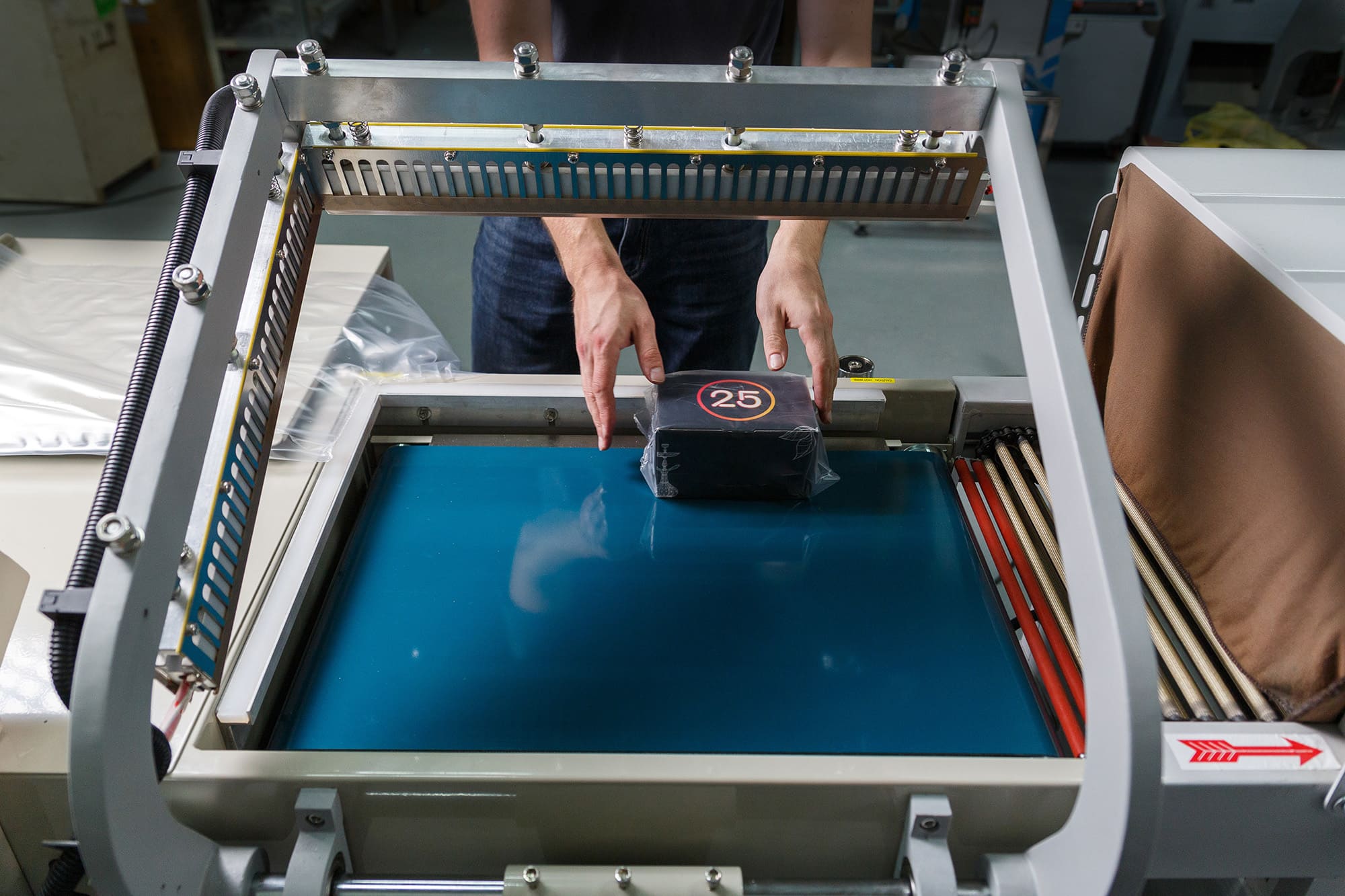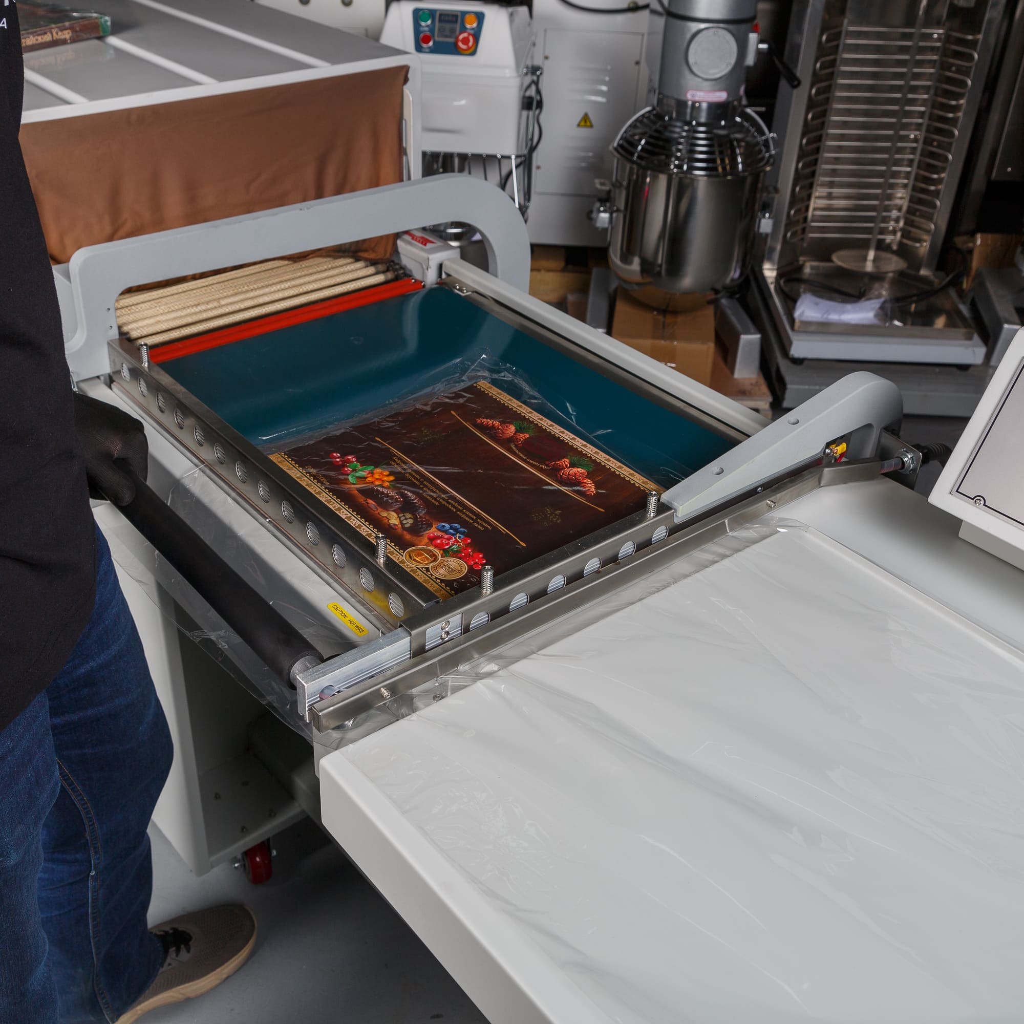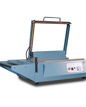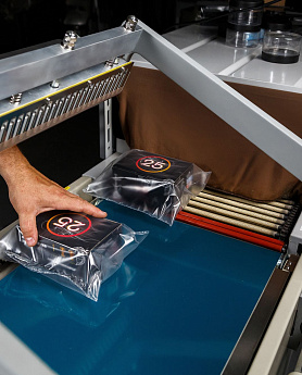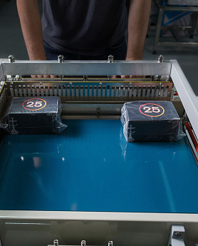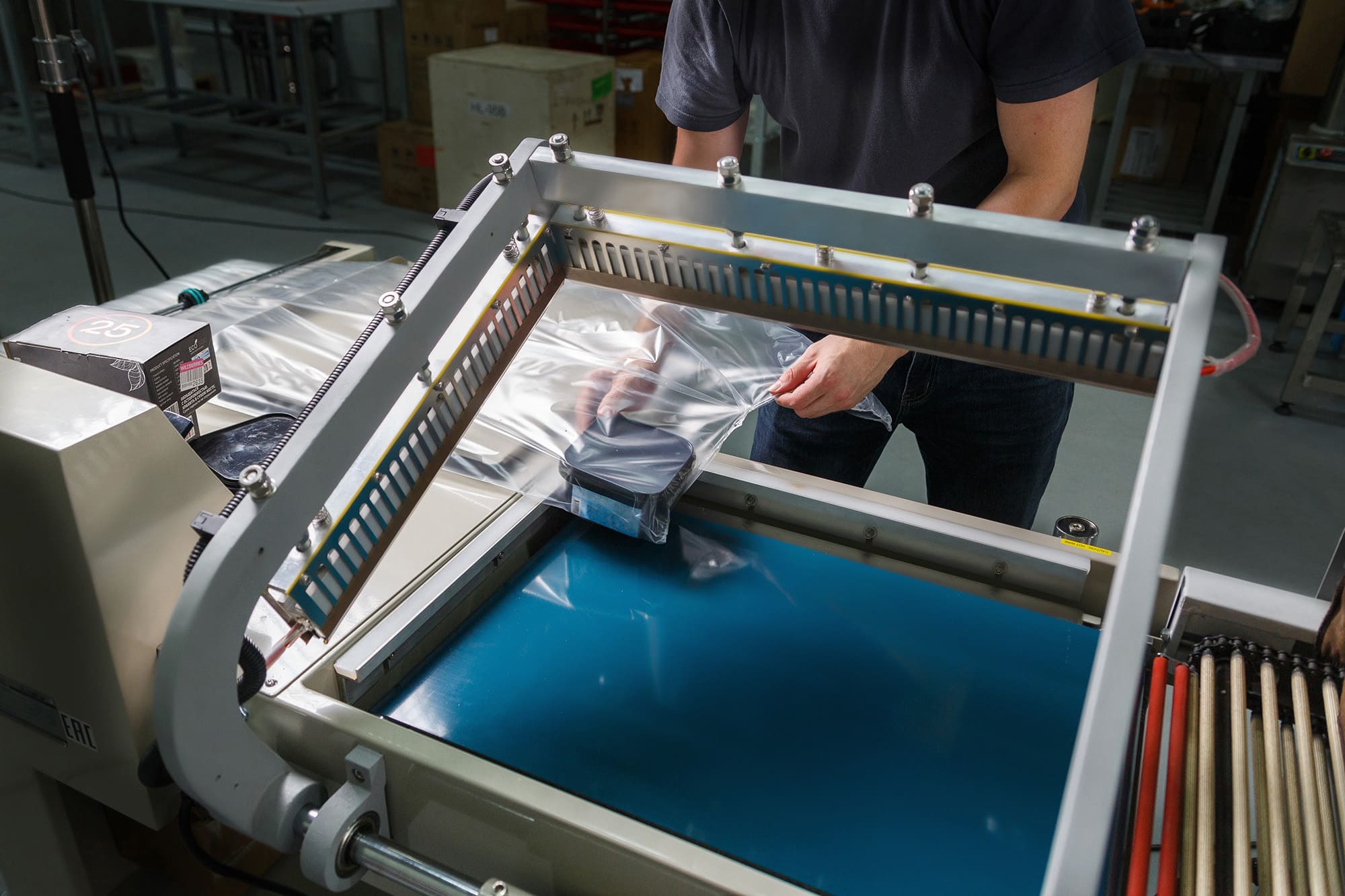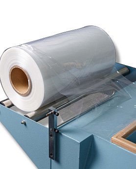 - Формирование пакета: Оператор отматывает нужный отрезок пленки, формирует полурукав, натягивает его на товар и отрезает, прижимая пленку к ножу.