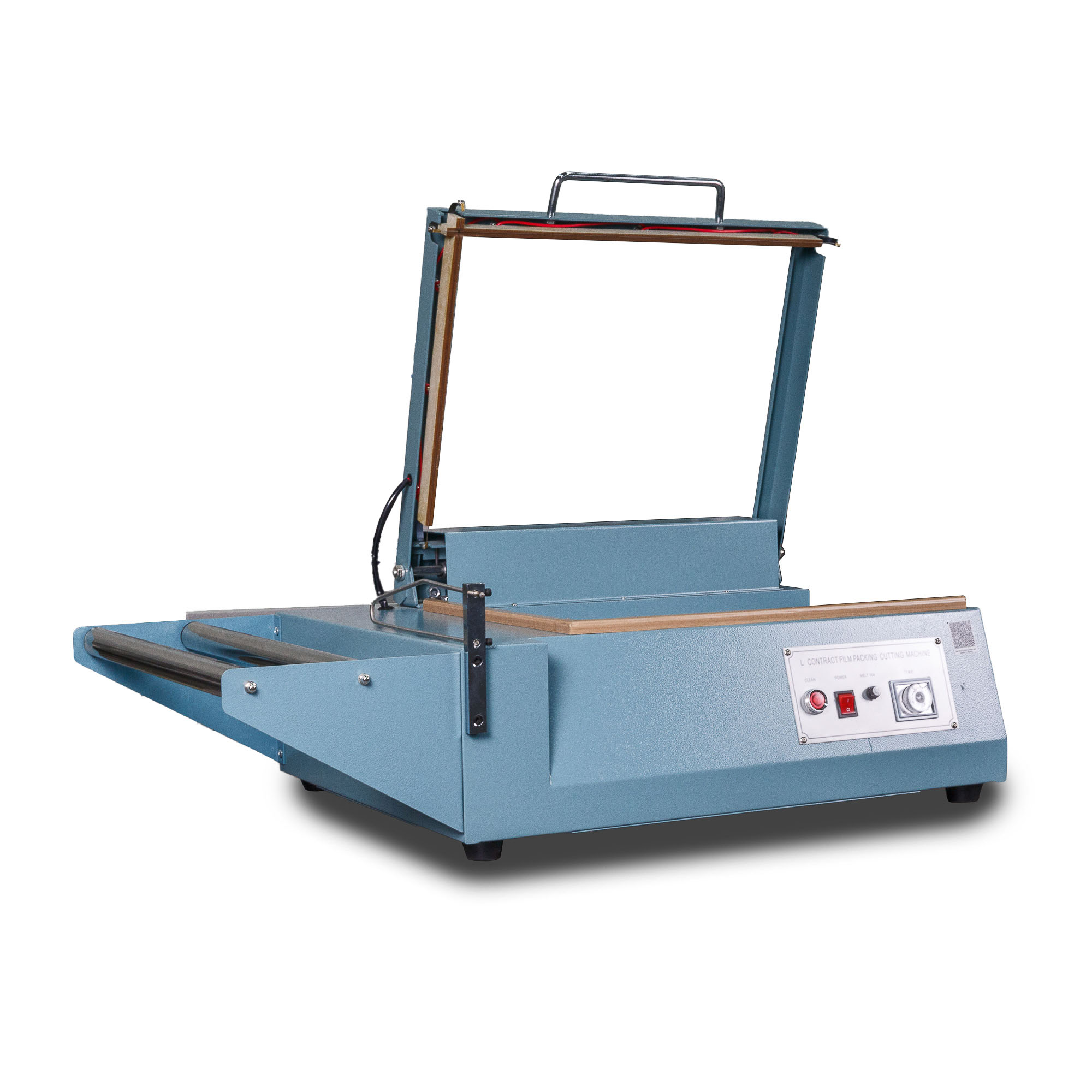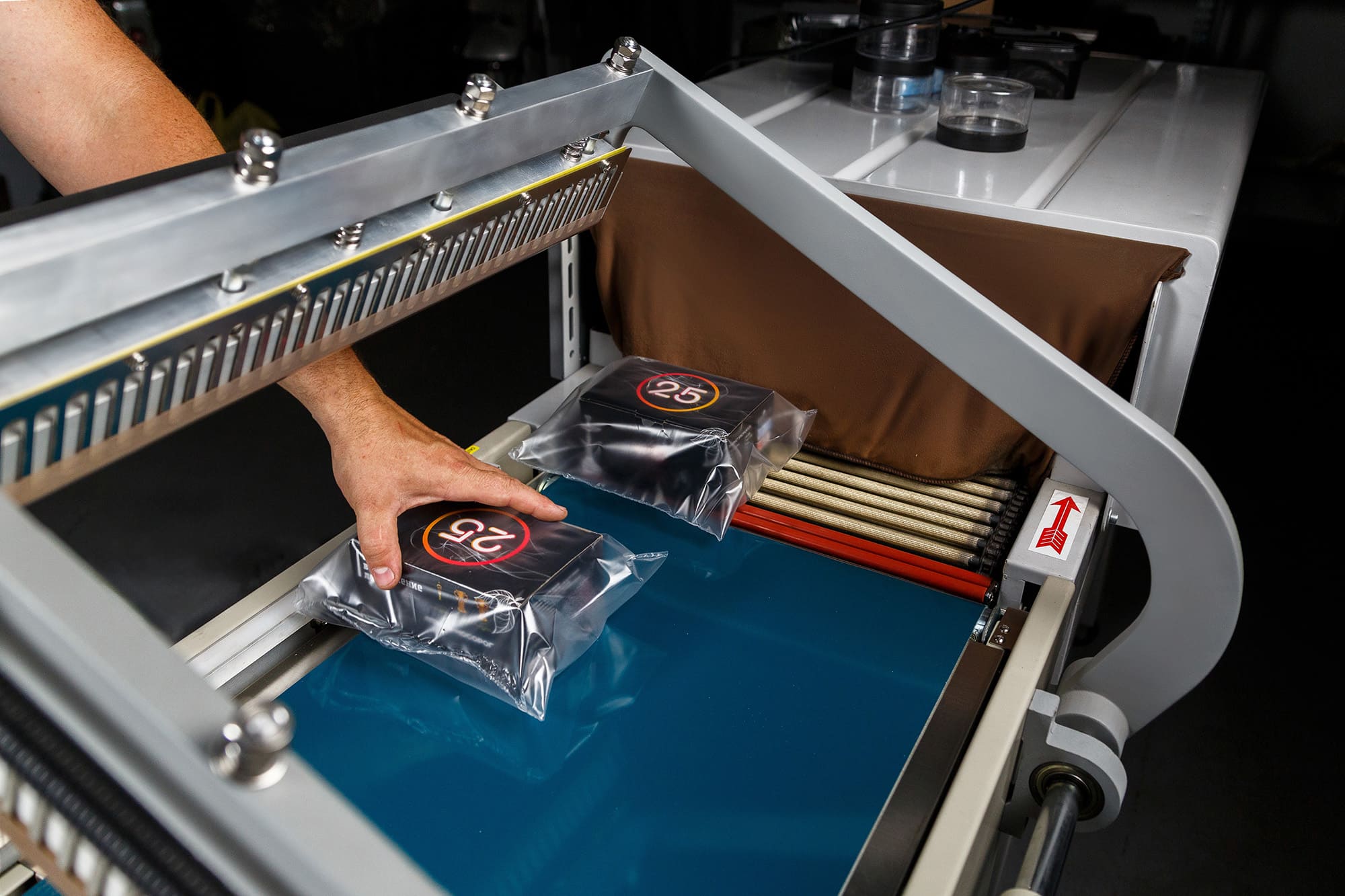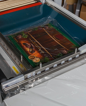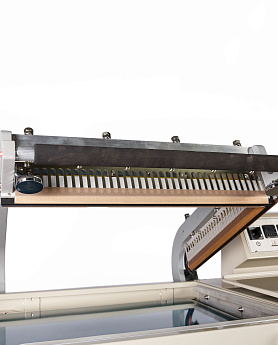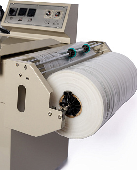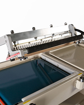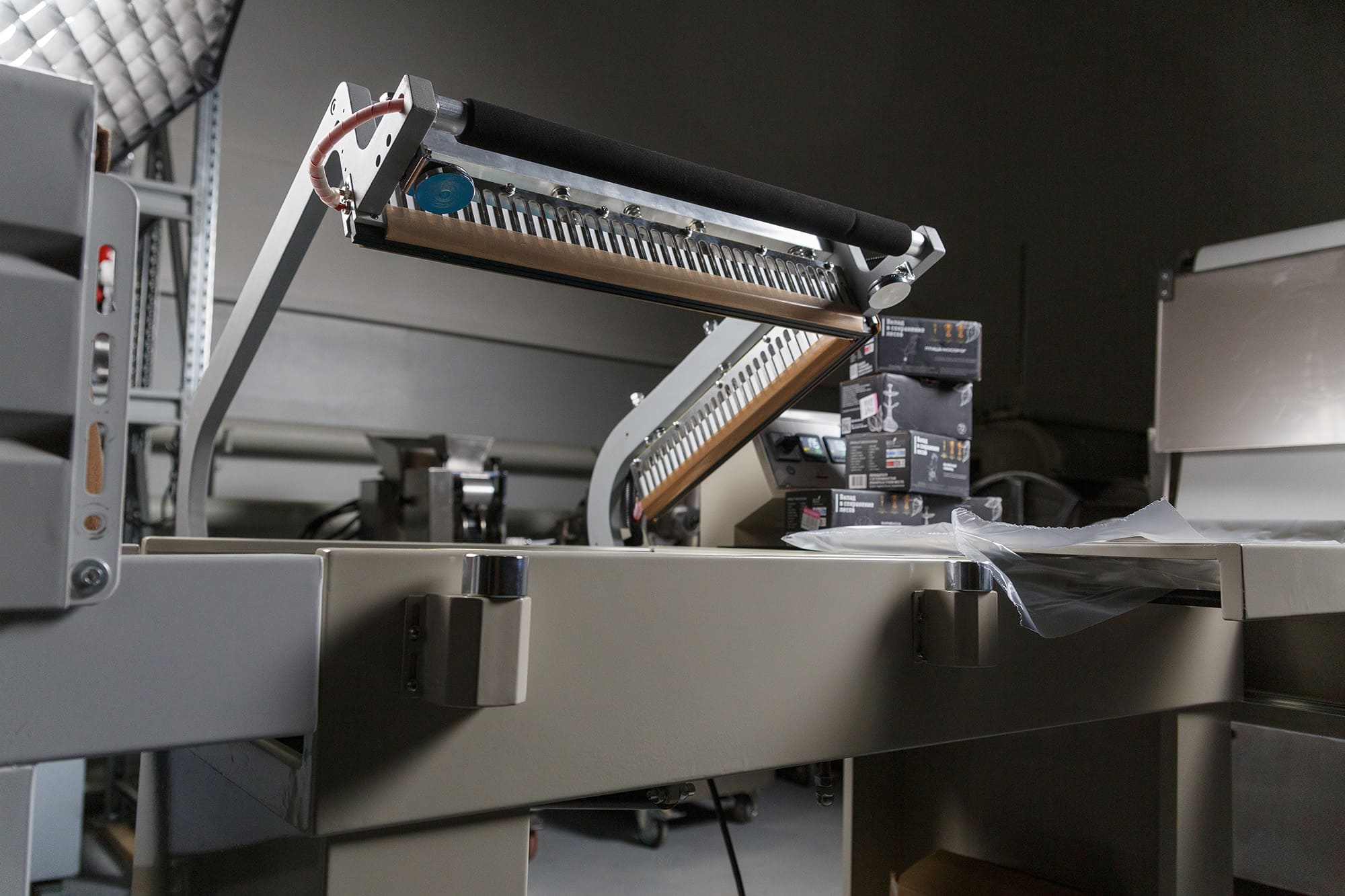 - Формирование пакета: Оператор отматывает нужный отрезок пленки, формирует полурукав, натягивает его на товар и отрезает, прижимая пленку к ножу.
