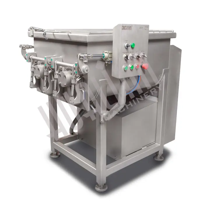 Фаршемешалка JB-150 представляет серию невакуумных фаршемесов. Модель предназначена для смешивания различных видов фарша с дополнительными компонентами (соль, специи, красители, усилители вкуса и т.п.) Разработана для пищевых производств средней и небольшой производительности. Объем дежи – 150 л, разовая загрузка – 80-110 кг.