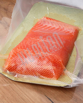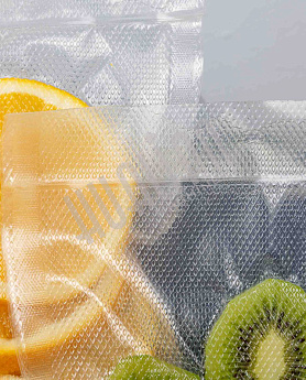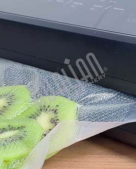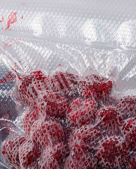 - Работа с рифлёными пакетами – обеспечивает плотное прилегание пленки и надежную герметизацию даже для продуктов с неровной поверхностью, таких как ягоды или нарезка.