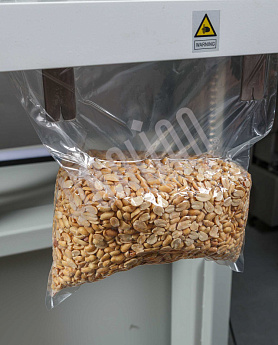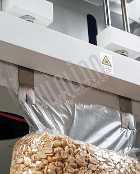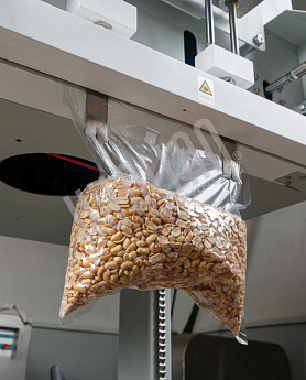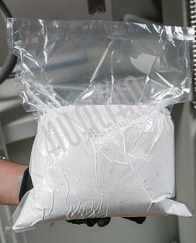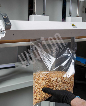 Первое, что хочется подчеркнуть – аппарат универсален. Он одинаково хорош как для пищевой, так и для химической, фармацевтической и прочих промышленностей. Именно поэтому для тестирования мы взяли два “продукта” из совершенно разных сред – стиральный порошок и орехи. Взяли мы их очень щедро, чтобы проверить, как промышленный вакуумный упаковщик справится с тяжелой ношей. Спойлер – результат отличный! Голова оборудование быстро регулируется по высоте, поэтому может работать с пакетами разного размера и веса.