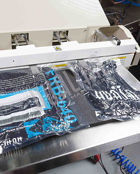 Первым в ход пошли наши фирменные футболки. Воздух был выкачан менее, чем за минуту, а после машина также быстро сделала ровный и плотный шов. Мы проверили, что руками практически невозможно его порвать. Упаковка получилась герметичной, аккуратной, а ткань при откачки воздуха деформировалась минимально.