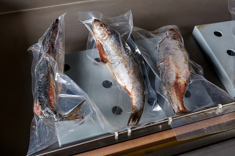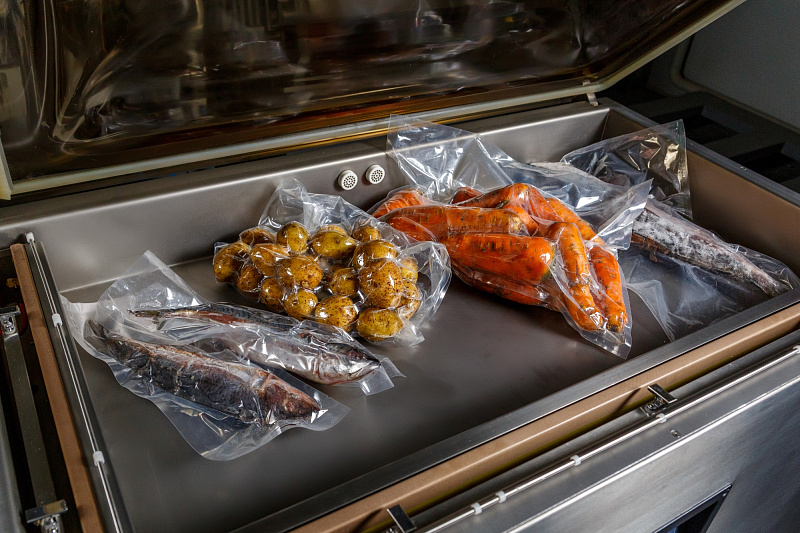 Упакованные в вакуумный пакет продукты не обветриваются и не пересыхают, они практически не меняют свой цвет. Поэтому вакуумирование так актуально при хранении мясных деликатесов, колбасной нарезки, сыров, кондитерских изделий, фруктов и зелени.